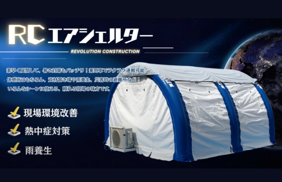 エアーポンプで組立が容易な(1分で立ち上げ)RCエアシェルターはエアーを流し続けることなく、専用エアコンもポータブルタイプでどこの現場へも運搬可能。お好みのデザインやロゴもオプションで装飾でき、大きさも4タイプなので休憩所や避難所、作業所と快適なスペースで現場に対応できます。