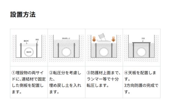 開発にあたっては、つるはし試験・曲げ試験などの耐久試験を実施。寒冷地では高密度樹脂では割れが発生、中密度では強度不足という課題があり、最終的に低密度ブレンドで最適なバランスを実現しました。設置は側板を先に埋設し、土砂を十分に転圧後、天板と連結材を取り付ける手順とすることで、強度・耐久性・施工性を兼ね備えた防護が可能となりました。