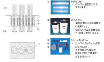 「開口部浸水対策工法」は、半永久的に硬化しない水膨潤型樹脂製止水材料「アクアストップ2100」、樹脂製半割管「CRK」、専用の無収縮モルタル材料を組み合わせたシステム工法です。地下ピットなどのダクト部のサイズや状況に合わせて、必要な材料数量を積算し、当社の自社規格水密性試験(0.049Mpsを30分間保持)に合格しています。