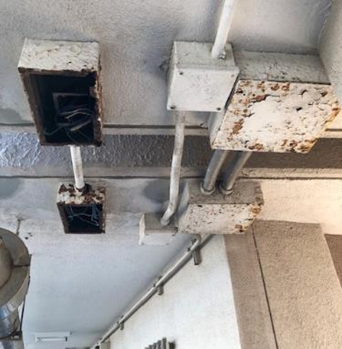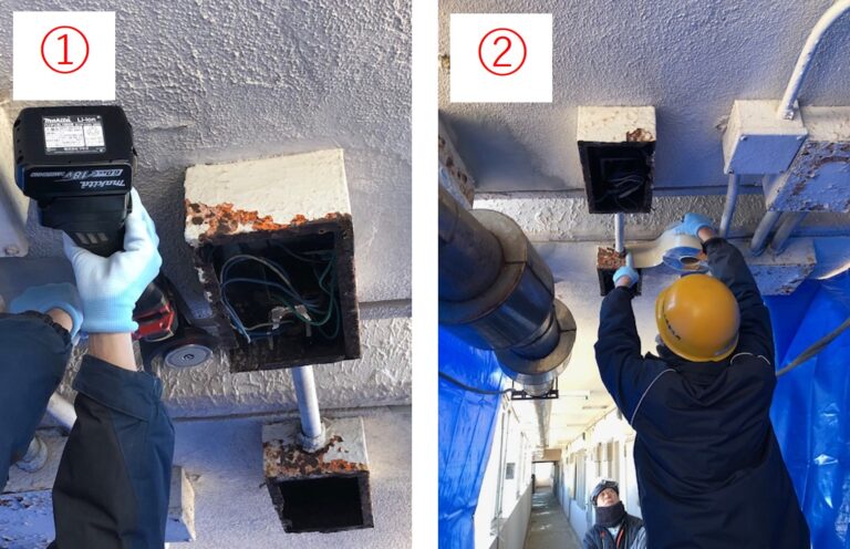 築40年の団地でボックス蓋が落下。腐食した開口部から鳥が巣を作っていたのが原因でした。これまで塗料の上塗りで補修してきましたが、鉄自体が劣化・剥落するレベルに。強電・弱電・通信のボックスすべてに同様の腐食が見られ、停電なし・短時間での対応が求められました。