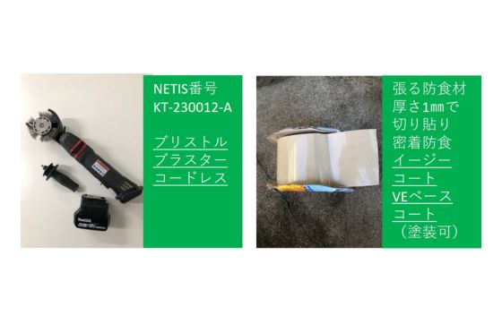 再劣化を防ぐには、塗膜と錆を徹底除去する必要があると判断。ブリストルブラスターコードレスで腐食部の旧塗膜と錆を除去し、貼るだけで防食できるイージーコートを施工。見積もり3日だった工程を、わずか半日で完了しました。イージーコート施工後は、必要に応じてステンレス板などで補強も実施しています。